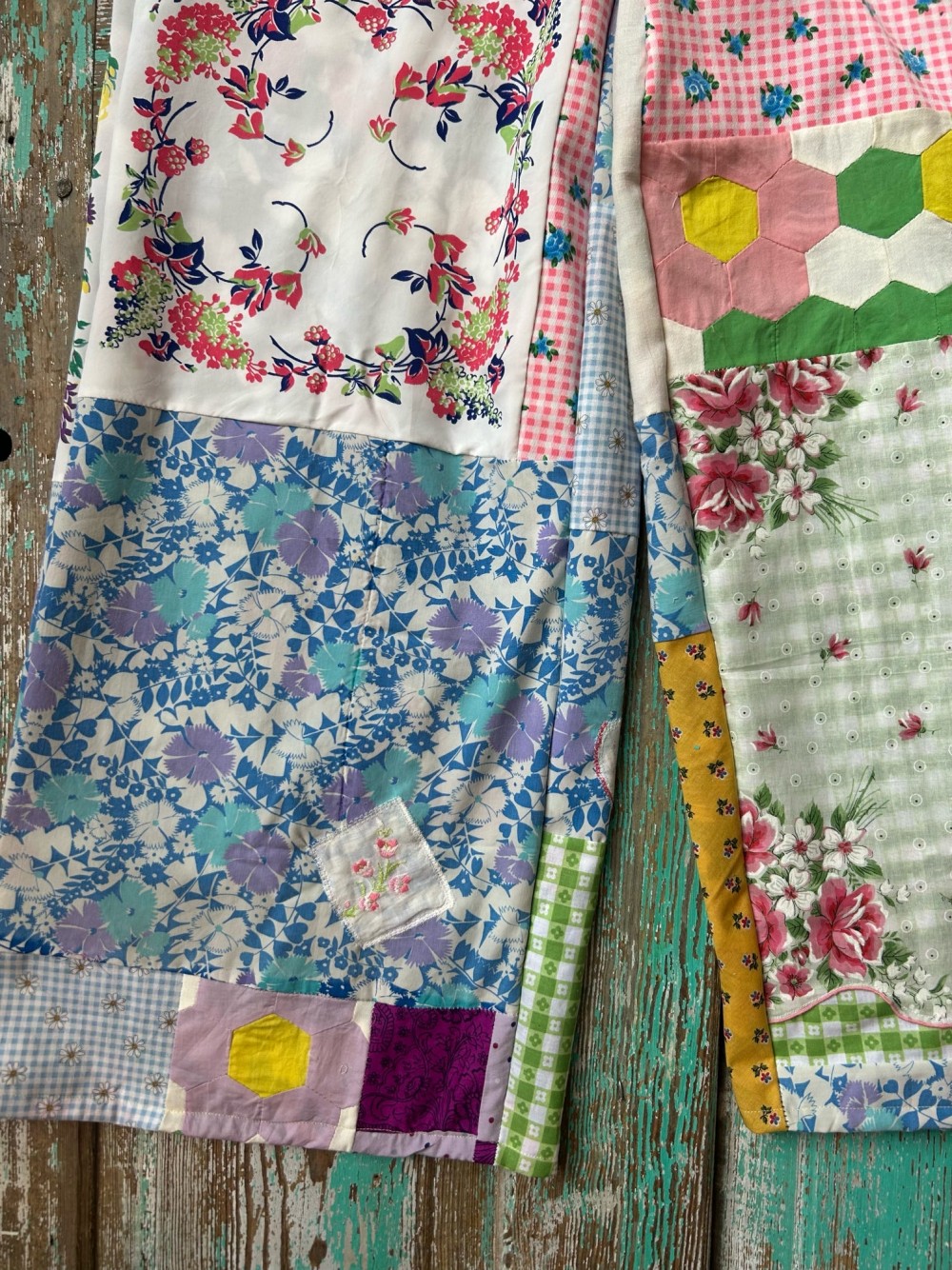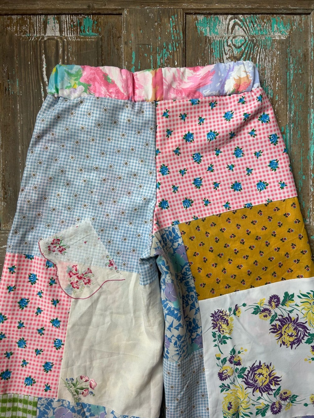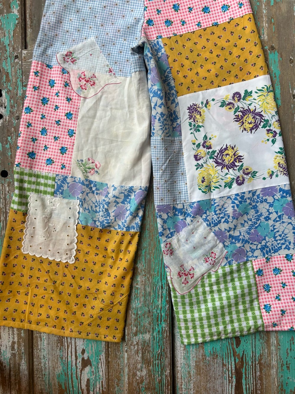trut your stuff with this one-of-a-kind pair of pants! Upcycled from quilts, handkerchiefs, and vintage cotton fabrics. Patched together by me! Fully lined with cotton fabric. Elastic waistband and pockets large enough for a smartphone.