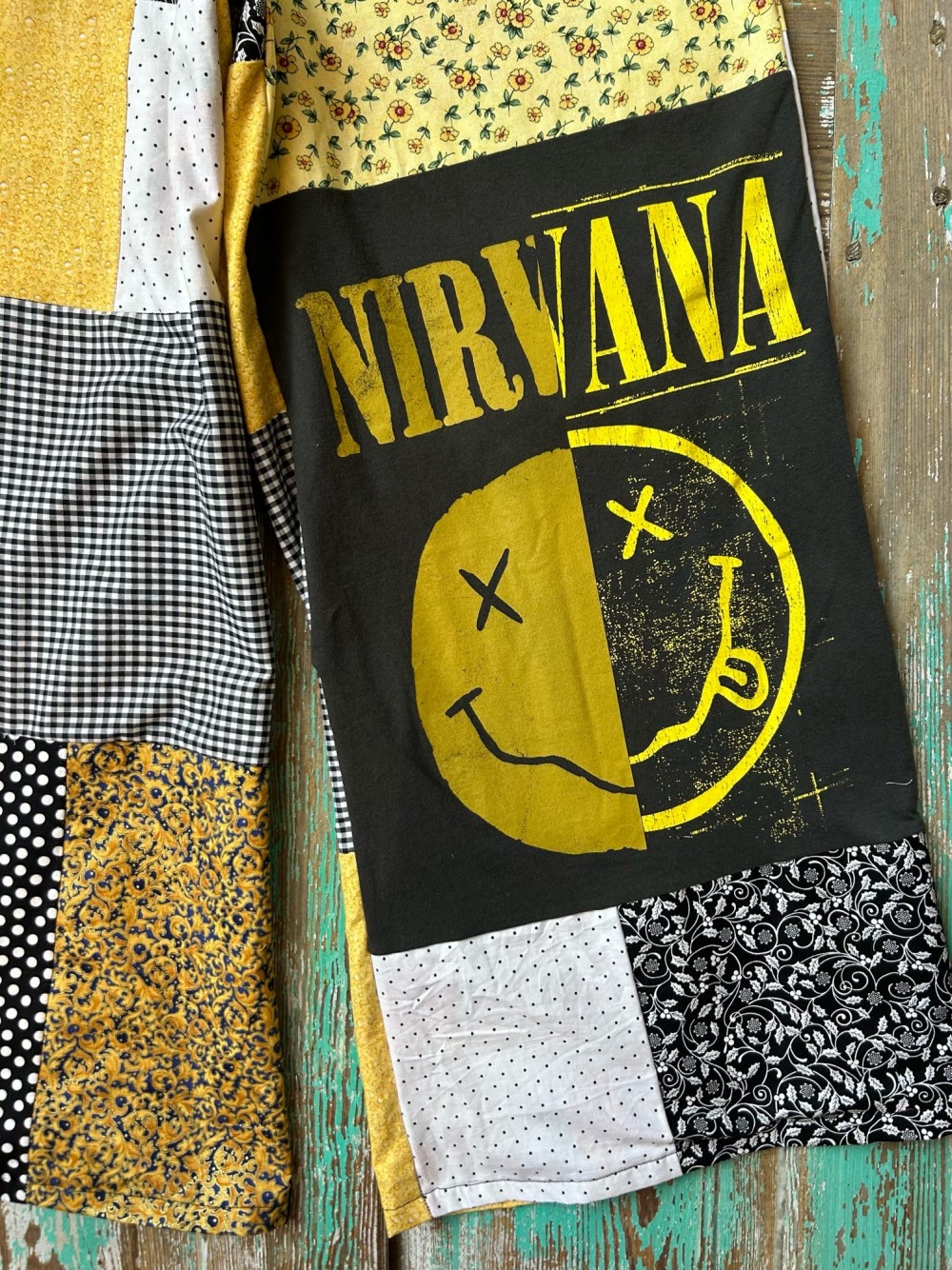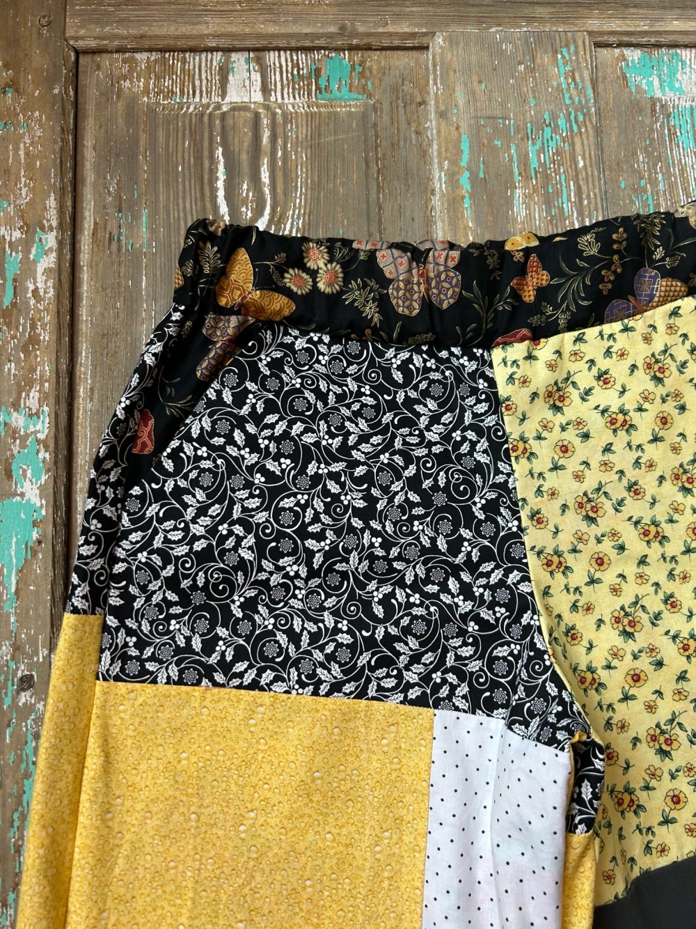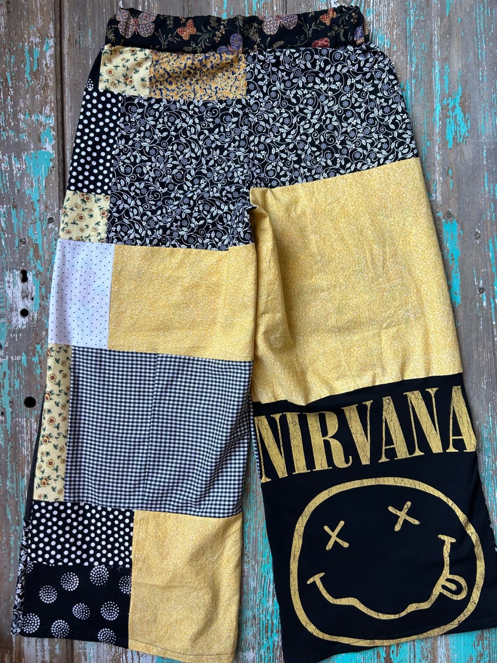trut your stuff with this one-of-a-kind pair of pants! Upcycled from t-shirts and vintage cotton fabrics. Patched together by me! Fully lined with cotton fabric. Elastic waistband and pockets large enough for a smartphone.
