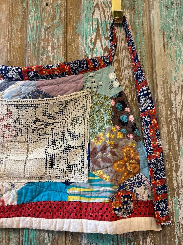 Crafted using a well-loved vintage quilt. Features waist ties as well as a pocket. Perfect for in the kitchen, garden, garage, or vendor fair! Unique, eclectic, one-of-a-kind.