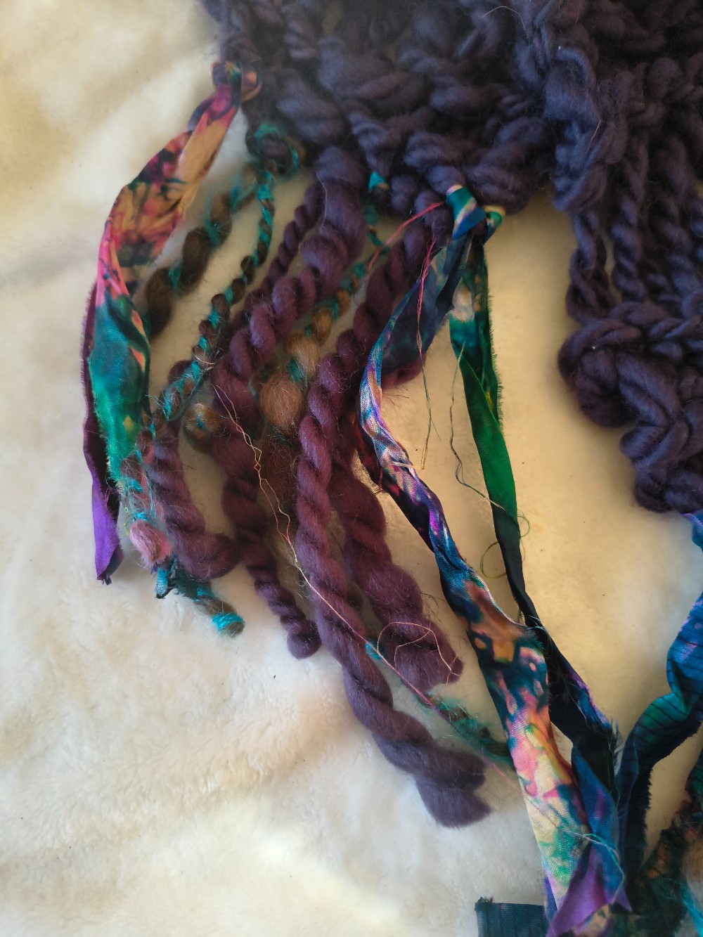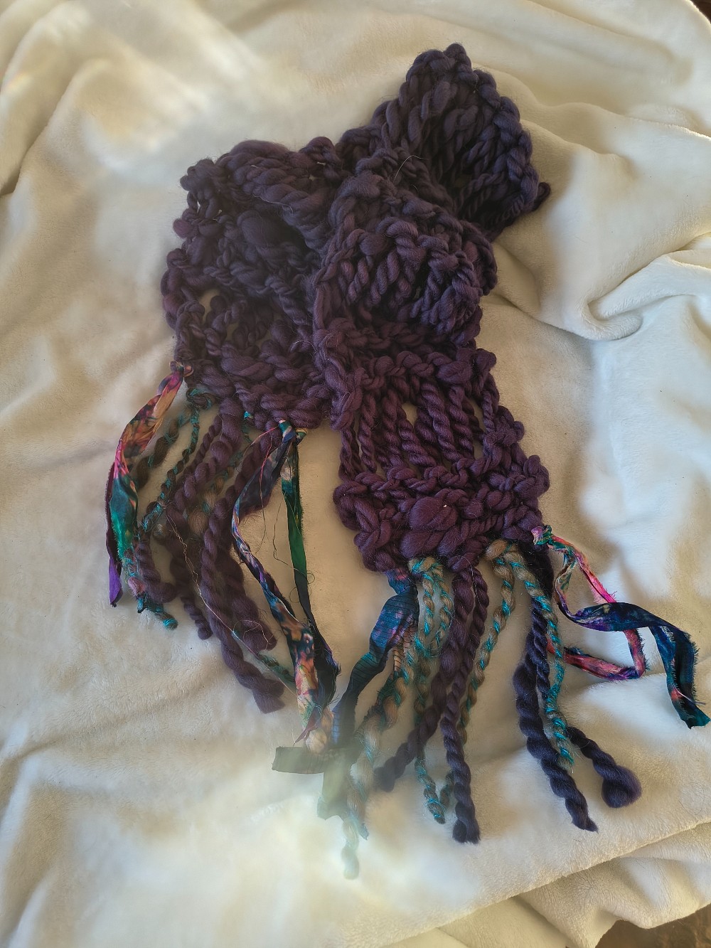 This bulky handknit scarf is made from my handspun yarn of the most luxurious merino with a colorful fringe of silk ribbon and handspun yarn from my ewe, Thelma.