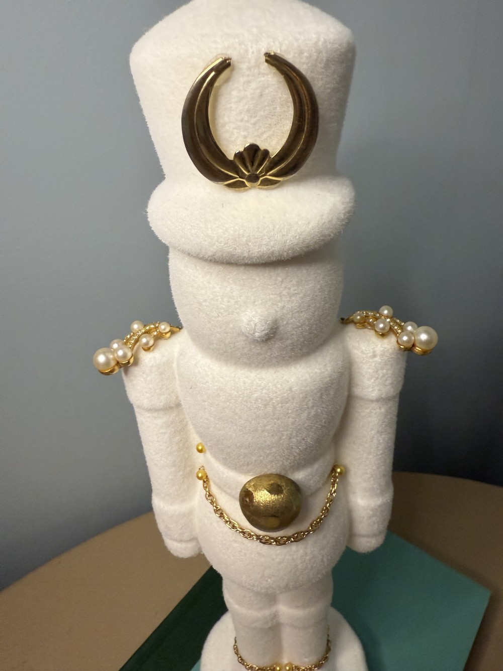 White flocked nutcracker adorned with gold and pearl vintage jewelry. 13.5" tall