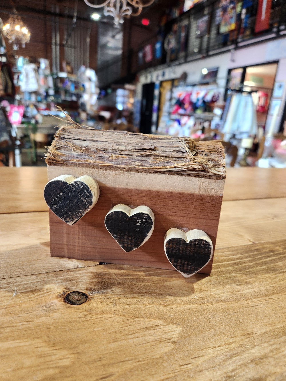 This shelf sitter has been made out of salvaged wood pieces and hearts made of leftover wood from other projects.