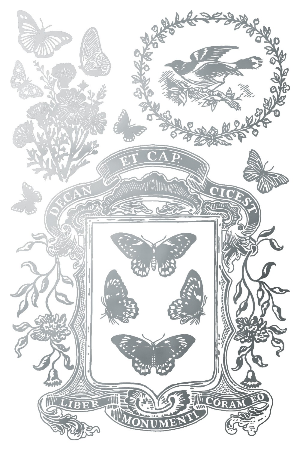 Introducing the Papillon – 8-Page 8x12" Gilded Transfer Pad—a sophisticated celebration of vintage artworks finished in a lustrous blend of gold and silver. This collection draws from 19th-century publishing ephemera, including bookplate logos, ornate motifs, labels, typography, and a charming series of birdcage illustrations. The mix of imagery blends both refined detail and playful character, all elevated by the metallic finish.