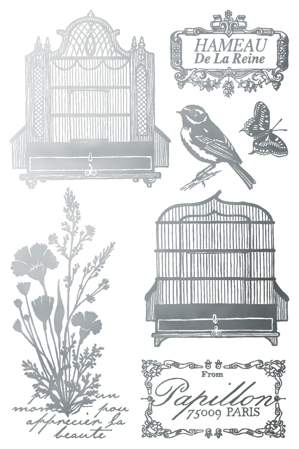 Papillon layers beautifully across a range of surfaces and can be used to create striking focal points or subtle gilded accents. The birdcages pair especially well with floral collections like Madeleine, allowing for elegant, mixed-style compositions. Whether applied to books, trays, décor pieces, or mixed-media artwork, this transfer adds a refined metallic touch that complements both vintage and modern projects.