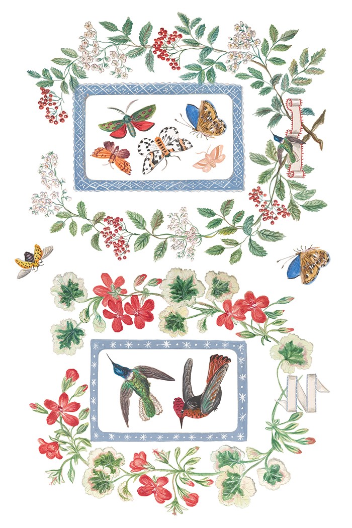 The Emily Claire – 8-Page 8x12" Transfer Pad comes from one of our favorite archive finds to date. Taken from an 1868 family album belonging to Miss Emily Clare Harvey, the artwork began as her pencil and watercolor illustrations lovingly added around her family’s portraits. The Cooper Hewitt preserved the album, and when we discovered it, Sam (our Senior Designer) and Sally immediately fell in love with its whimsical, beautifully hand-painted details. The set includes charming elements like kittens, hummingbirds, butterflies, banners, and even a proud little rooster—each one quirky, delicate, and full of character.