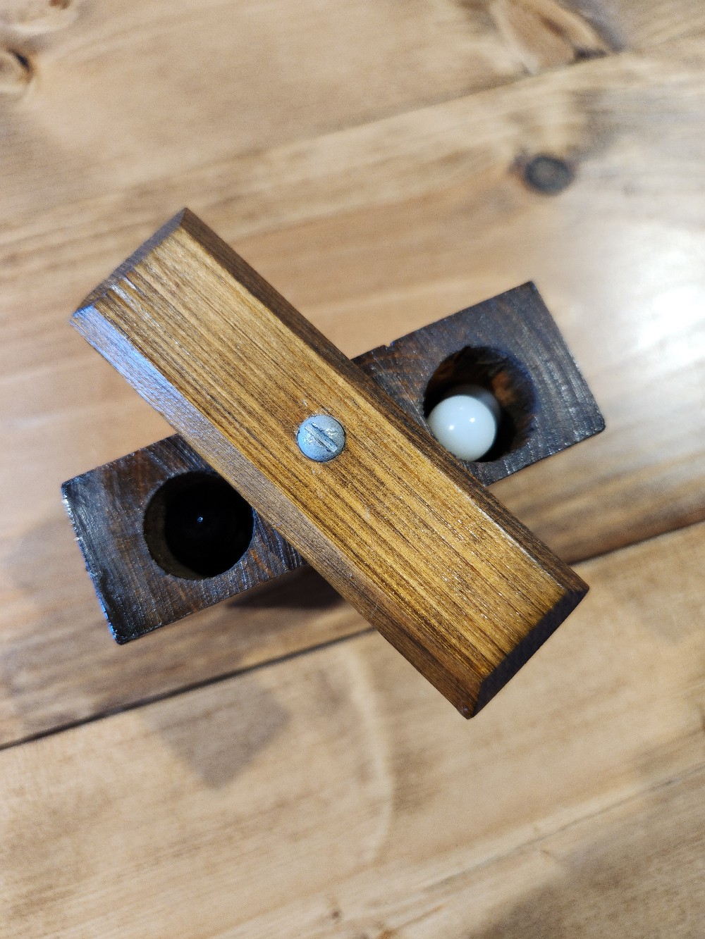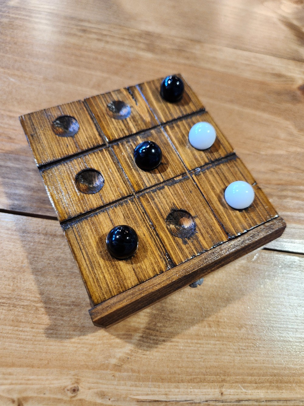 Wooden, handmade tic-tac-toe board with marbles.