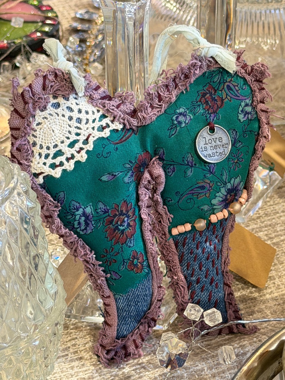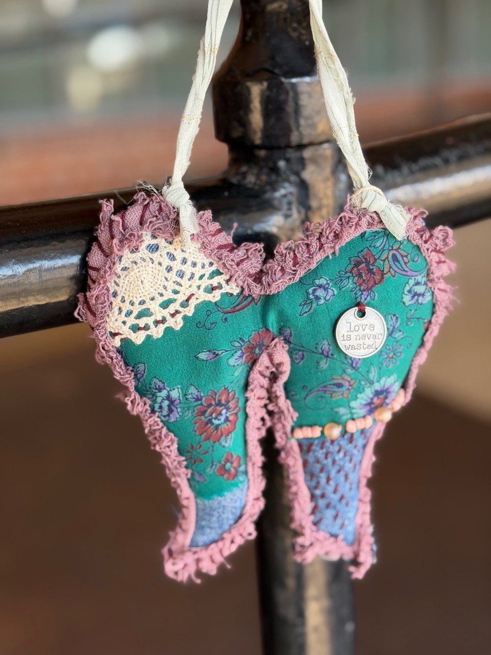 This stitched angel wing is soft-spoken, but full of feeling. Made with layers of teal chiffon print, a whisper of lace trim, and hand-stitched embroidery in deep plum, it’s grounded by a denim base that gives it that worn-in, well-loved vibe.